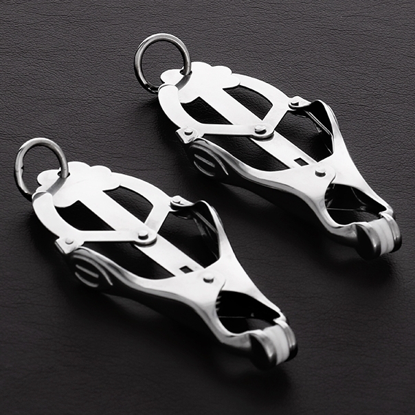 Pinces pour les tétons en métal avec un embout en caoutchouc. Serrage puissant. Poids de 16 grammes. Pas de chaîne. Dimensions : 9 x 4 cm.