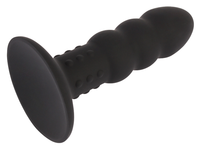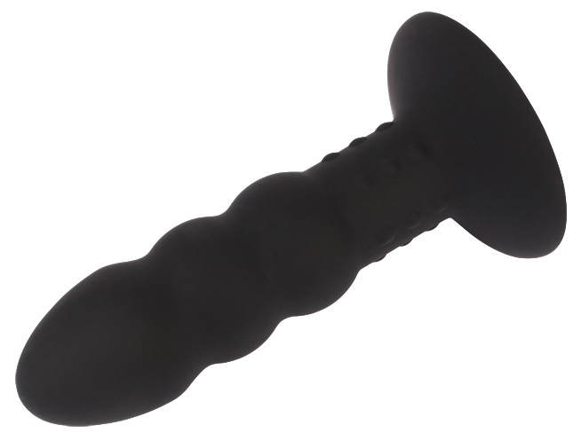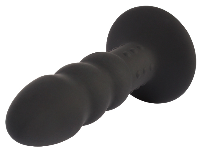 Plug avec une surface ondulée dont la largeur est de 3.2 cm.Longueur insérable de 11 cm. Partie rétractée perlée de 2.5 cm. Avec une ventouse. En Silicone