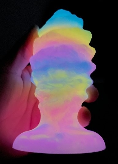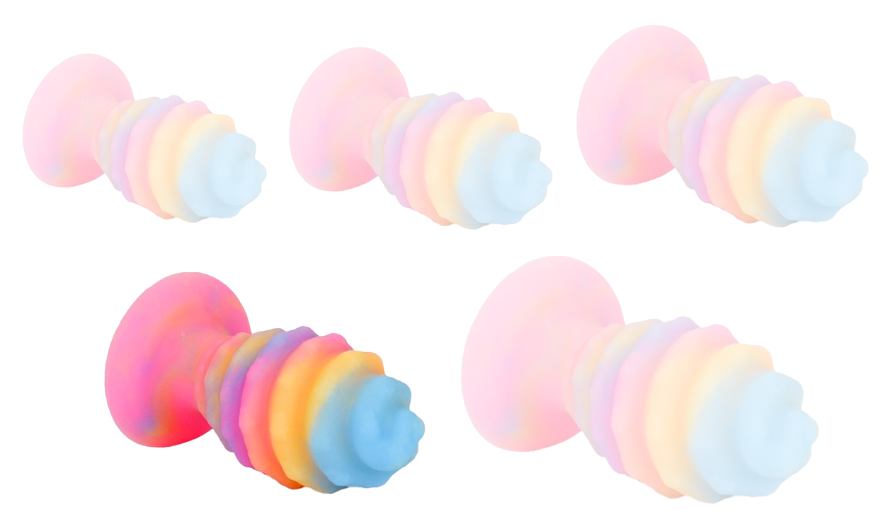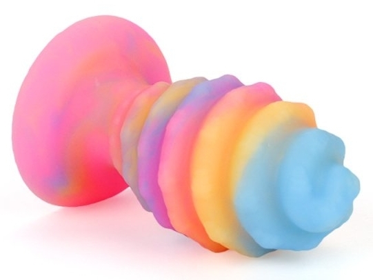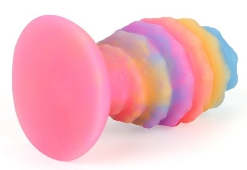 Plug XL en forme d’oeuf. Relief en spirale, avec une base ventouse. Longueur insérable de 14 cm pour une largeur de 4 à 7 cm. En silicone multicolore phosphorescent