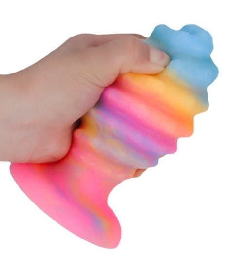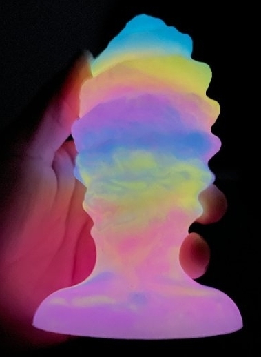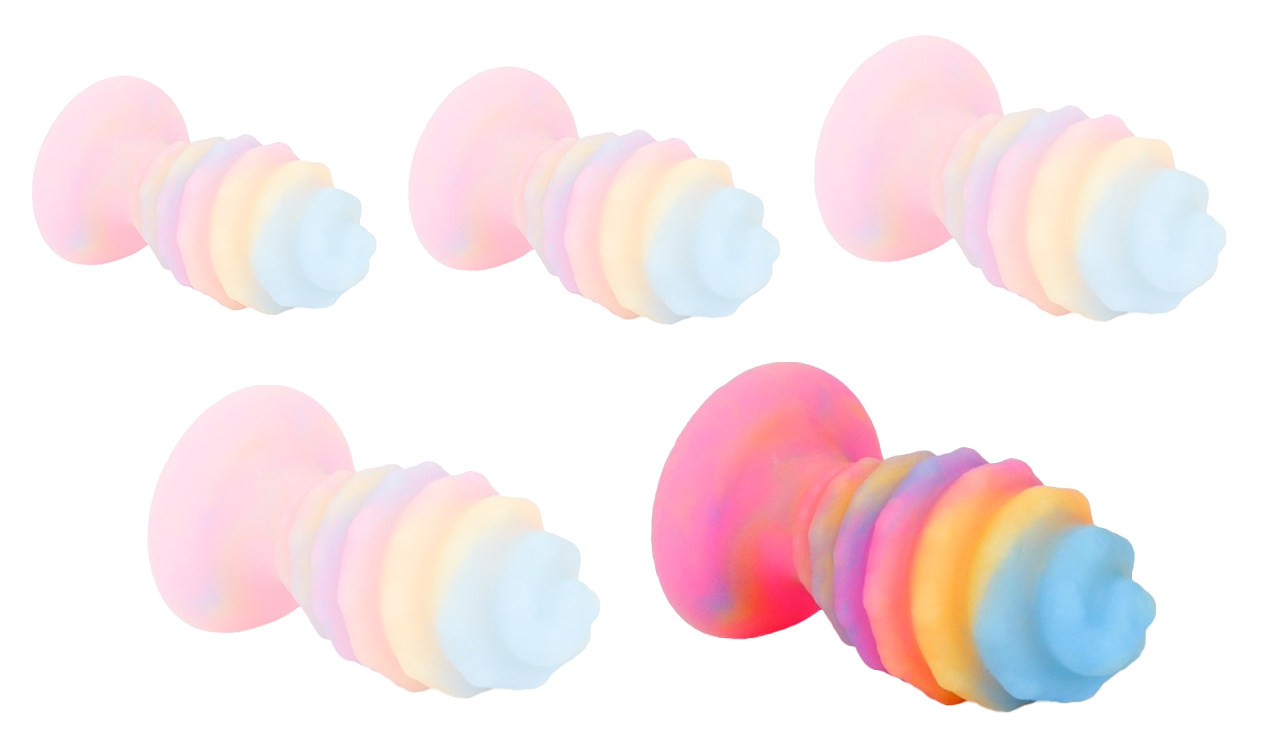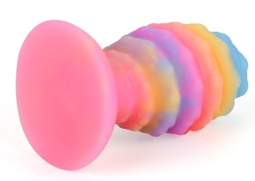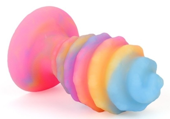 Plug XXL en forme d’oeuf avec relief en spirale, phosphorescent. Longueur insérable de 15 cm et largeur de 5 à 8 cm.  En silicone, avec une base ventouse.
