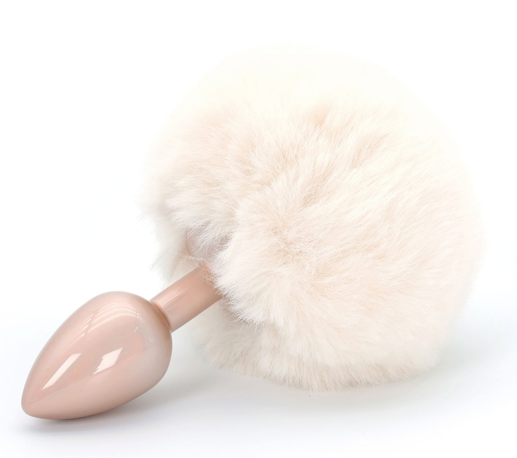 Plug queue de lapin avec pompon blanc. Longueur insérable de 5 cm et largeur de 1 à 2.8 cm. En verre acrylique avec revêtement aluminium.