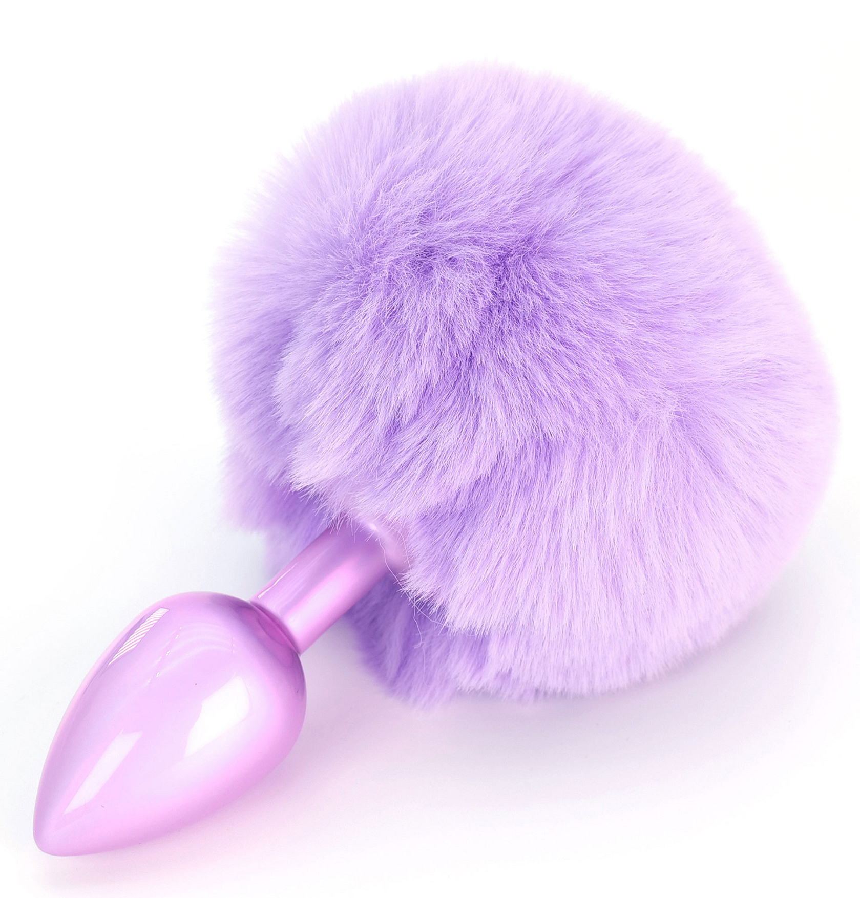 Plug queue de lapin, avec pompon violet. Largeur de 1 à 2.8 cm et longueur insérable de 5 cm. En verre acrylique, recouvert d’aluminium.