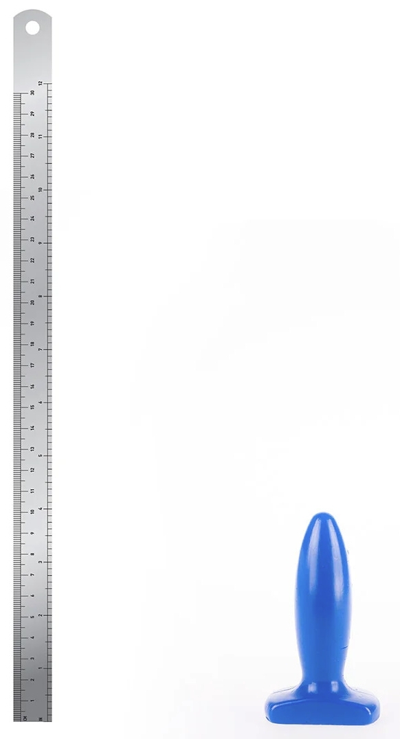 Plug bleu de 8.5 cm de longueur insérable et de 3 cm de largeur.Avec une surface lisse.La base est plate. En caoutchouc souple PVC