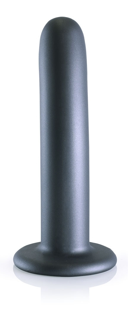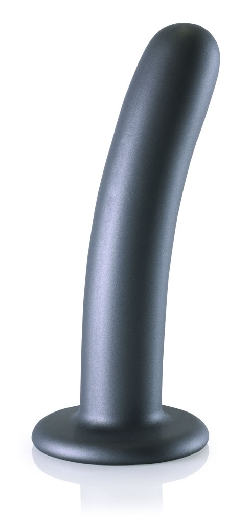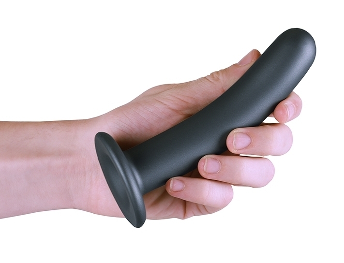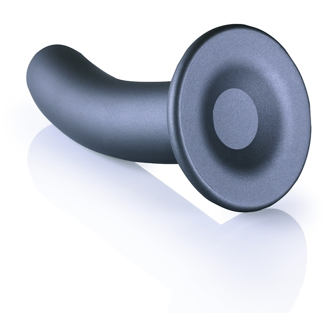 Le plug Smooth G-Spot M de la marque Ouch! est réalisé avec une longueur insérable de 14.5cm et une largeur de 3cm.La forme est courbée et la surface est lisse. Il est ici dans sa version grise. Avec une base ventouse adaptable sur un harnais de gode-ceinture.