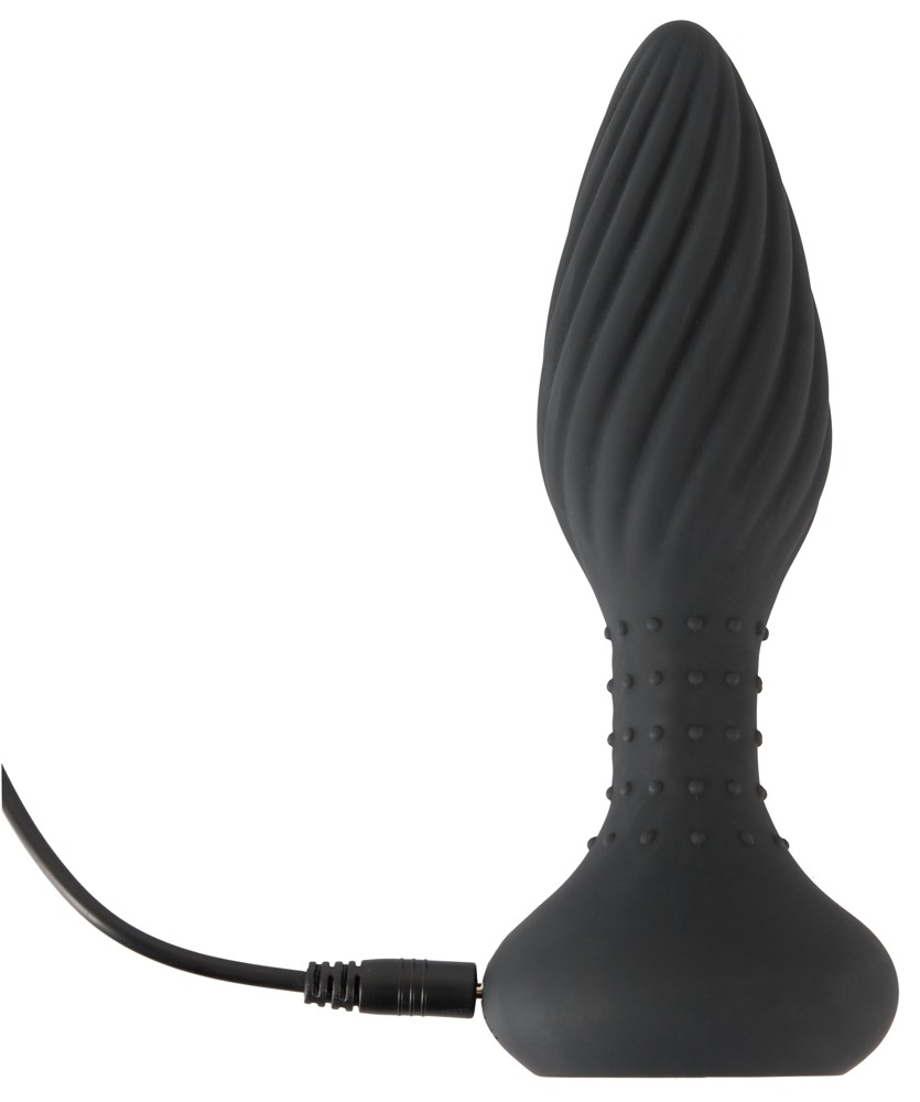 Plug vibrant de 12 cm de longueur insérable et de 4.2 cm de largeur maximale.Avec 10 modes de vibrations.La base comporte des billes rotatives qui fonctionnent avec les vibrations. Surface torsadée et petits picots à la base. En silicone.Recharge USB (Pile CR2032 fournie pour la télécommande).