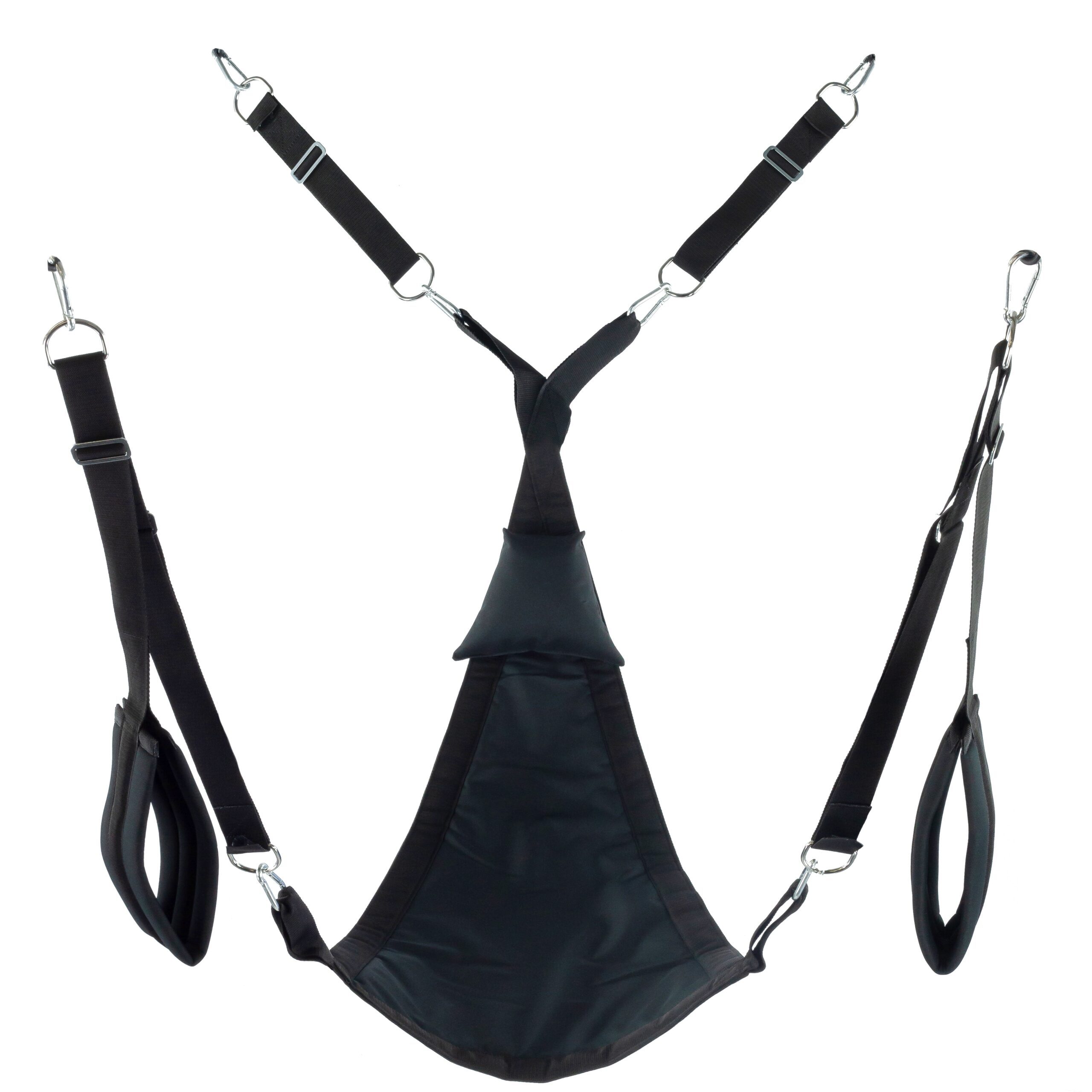 Ce sling en tissu de la marque Mr Sling est conçu avec une toile noire en forme de Triangle.Le kit se compose de : le sling de 64 x 115cm les 4 suspensions avec les mousquetons en métal les supports pour pieds rembourrés (largeur de 11cm) le coussin triangle noir (24 x 20cm). Matière : polyester Avec le sac de rangement