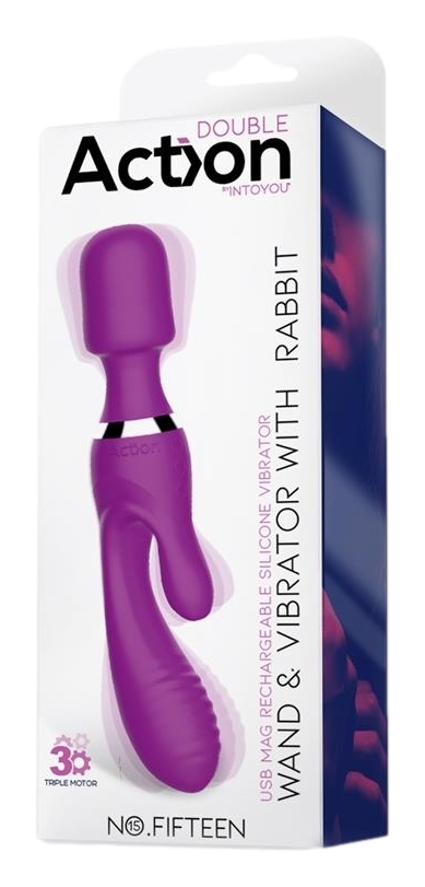 Le Vibro et Wand Fifteen de la marque Action est composé du vibro de 11 x 3.8cm avec 7 modes de vibrations. Avec un rabbit vibrant et une tête de wand avec 7 rythmes de vibrations (tête de 40mm). Longueur totale de 23cm. En silicone.Recharge USB