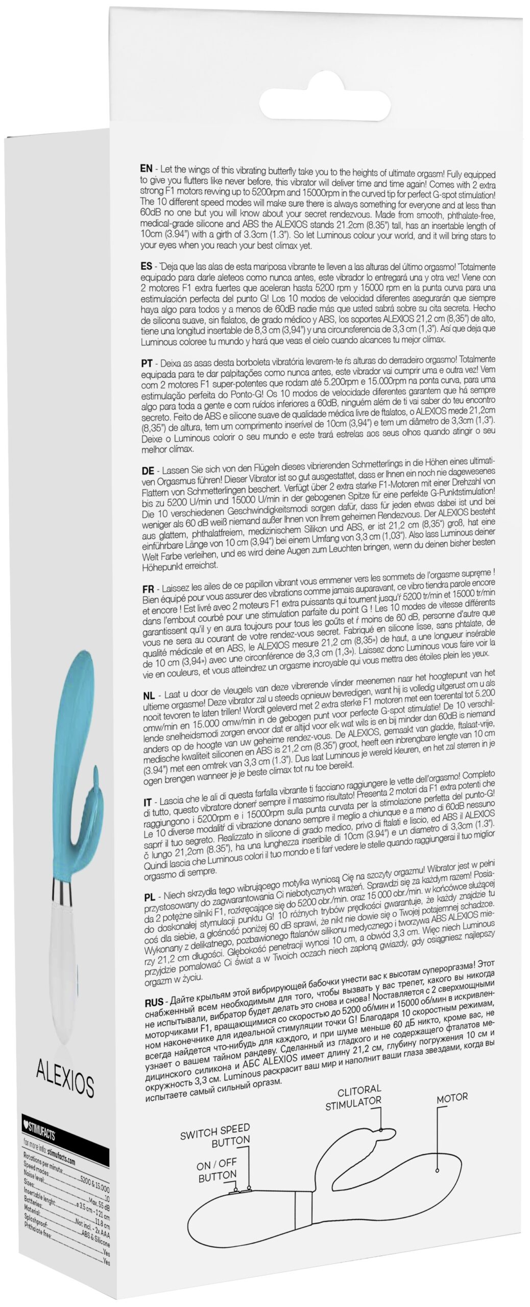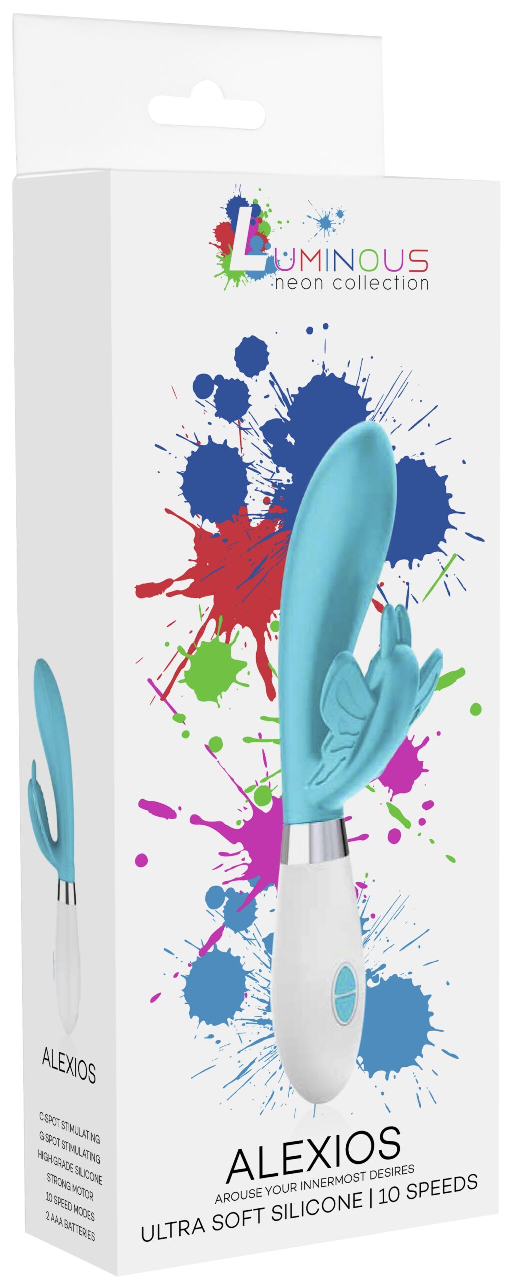 Le vibro rabbit Alexios est un sextoy conçu avec une forme courbée excitante.Il permet de stimuler le point G grâce à sa partie insérable de 10 x 3.5cm.Le rabbit en forme de papillon stimule le clitoris. Avec 2 moteurs et 10 modes de vibrations